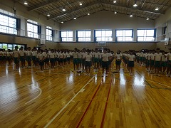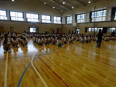 体育大会の予行を行いました。昨日からの雨でグランドは使えず、体育館での予行となりました。行進等は昨日の全校体育でしっかりできていたので、今日は、開会式と閉会式の流れのみ行いました。ブロック長4人の選手宣誓は、なかなか元気があってよかったですね。あと2日、雨が降らないことを祈るのみです。