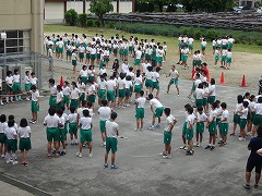 体育館での予行 予行後、ブロックごとに水たまりの無い場所で大縄練習
