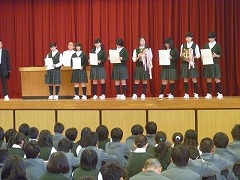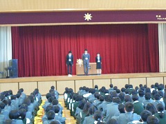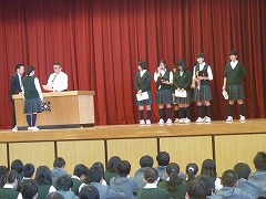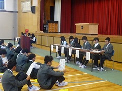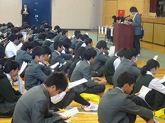 後半、生徒総会では、生徒会の方針、事業計画、委員会の活動方針等の説明がありました。保健委員会の説明が終わり、次の図書委員会の説明が始まる前、みんなが議案書のページをめくる音がサッと聞こえてきました。議案書をしっかりと読んでいる証拠ですね。