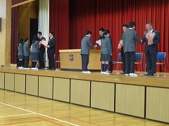 本日、離任式を行いました。仕事の都合で出席できなかった教員も含め、9名の教職員が転退職しました。在校生と、多くの卒業生が、新聞等を見て駆けつけてくれました。各先生から、培良中を去るにあたって、様々な思いや、これからの培良中への期待等を話していただきました。
