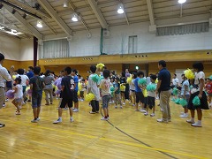 今日は、せせらぎの体育館で、京田辺市の夏の地域学校が行われました。京田辺市の小中学校、そして南山城支援学校の児童生徒も集まって、みんなで歌を歌ったり、ゲームをしたりして、半日交流し、楽しみました。
