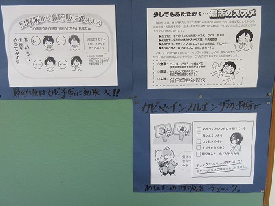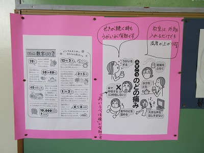 毎日寒い日が続いています。各学級欠席者も少しずつ増えてきています。早寝早起き、手洗い・うがい等、風邪予防に努めてください。保健室前の廊下に張り出されている風邪・インフルエンザ予防についての掲示物を紹介します。