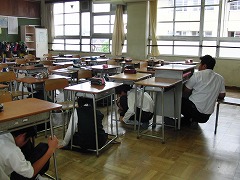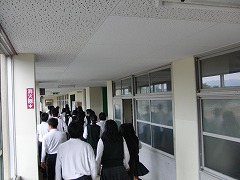 本日6校時、防災訓練を行いました。京都府南部に緊急地震速報が出て、その後、大地震が起こり、校舎が火災に見舞われるという設定でした。当初の予定では、消防署の方にも来ていただき、逃げ遅れた生徒を、はしご車で救出してもらう予定でしたが、あいにくの雨で、避難場所をグランドから体育館に変更し、学校内だけで行いました。