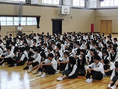 緊急地震速報の後、全員が頭部を保護するため、机の下に入りました。その後、放送の指示で体育館に避難しました。放送から、全校が避難、点呼が終わるまで3分24秒、昨年の冬、グランドで4分8秒(過去最短?)だったのと比べ、さらに早く避難できました。4年前に、体育館までの避難の記録が残っていました。4分9秒でした。
