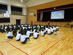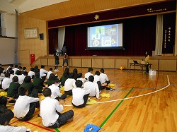 2年生は7日、5校時に体育館で食育のお話を聞きました。講師は、京田辺市教育委員会の管理栄養士の桐村先生です。京田辺市をはじめとする山城地方の特産物や、それを材料にした郷土料理、伝統食、行事の時に特別に作られた行事食などについて、豊富な写真を用意して、説明していただきました。地産地消の大切さについて改めて考えました。