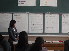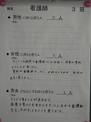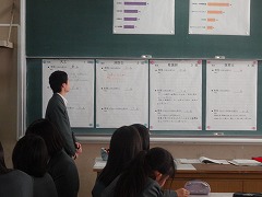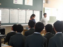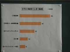 11月30日(金)、3年生の各学級は、午前中に1学級ずつ、家庭科の授業で、男女共同参画について考える学習を行いました。京田辺市市民参画課の皆様とのコラボレーションです。あらかじめ、女性に向く職業、男性に向く職業を話し合いました。男性の仕事というイメージでは、大工さん、消防士、などが挙がり、女性の仕事としては、キャビンアテンダント、保育士、看護師などが挙がりました。