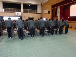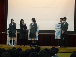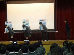 本日6校時、体育館で、3年生は、京都すばる高校の企画科のみなさんの指導を受け、ビジネスマナー講座に取り組みました。礼儀正しいコミュニケーションの取り方、お辞儀の仕方、身だしなみ、実際の面接試験の時の注意事項等、説明やコント、アンケート等で分かりやすく教えていただきました。