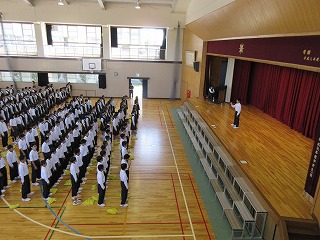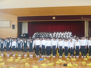 明日はいよいよ文化発表会当日を迎えます。6校時は全校で直前の全校練習を行いました。生徒会本部とパートリーダーが中心となって、うまく練習を進めてくれました。並び方も、本番仕様になり、声も大きく迫力が出てきました。明日のけいはんなホールでの発表が大変楽しみです。