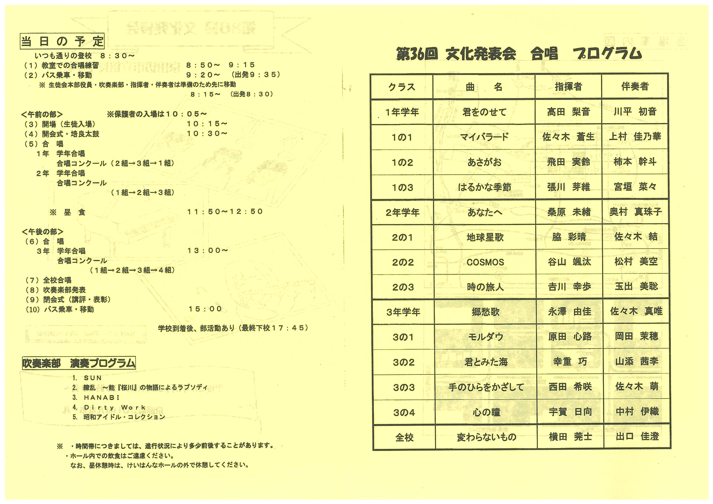 参観される保護者の皆様には、会場後部が保護者席となっています。十分余裕がございます。生徒の思いのこもった合唱や演奏を最後までお楽しみください。また、自家用車で来られる方には、当日、ホールのご厚意で、駐車場を無料開放していただいてます。スペースも十分ありますので、気を付けてお越しください。