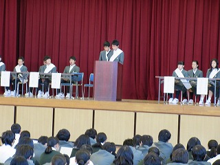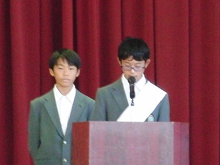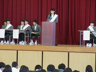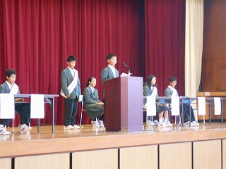 候補者と応援者は、前で堂々と自分の意見を述べました。特に挨拶運動について触れた人が多かったように思います。また、今までの培良中の伝統や良さを継承しつつ、みんなの意見を活かして、さらに良い学校にしていきたいという思いがあふれていました。聴いている人も真剣に聞きました。