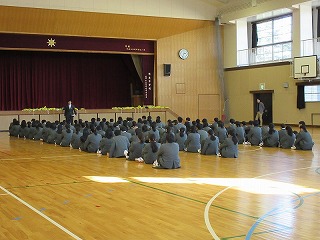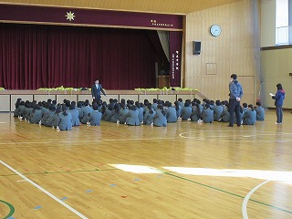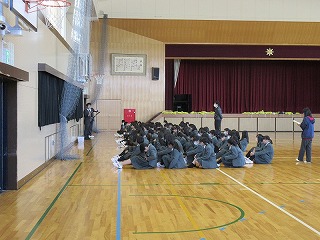 本日6校時、2年生は、修学旅行に向けて学年集会を持ちました。初めに、集合の仕方や様々な並び方に挑戦しました。部屋ごとの並び方などは、みんなが部屋番号を記憶していないと難しいのですが、素早く並べていました。