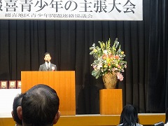 本日午後、井手町の自然休養村管理センターにおいて、標記の主張大会がありました。綴喜地方の2市2町の代表、小学生10名、中学生6名が参加し、日ごろの学校生活等で考えたことを主張しました。