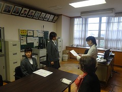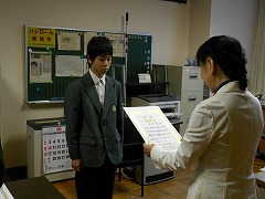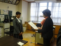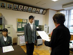 10月28日放課後、夏休み明けに提出した「明るい選挙」のポスターと標語の表彰が行われました。京田辺市選挙管理委員会の方が、直接、培良中の校長室まで来ていただき、表彰を行いました。標語は、京田辺市選挙管理委員会委員長賞1名。入選3名。ポスターは、入選1名でした。