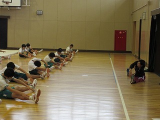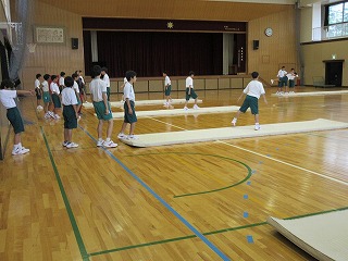 今日は、教育実習生の研究授業。1年生の体育。マットの授業です。今まで練習してきた技の復習と、新しい技(伸膝後転、ロンダート)の練習でした。グループに分かれ、熱心に取り組んでいました。実習生も各グループを回って、アドバイスを盛んに行いました。みんなの前で、見本の技をやってくれる男子もいて、上手で、かっこいいなと感心しました。
