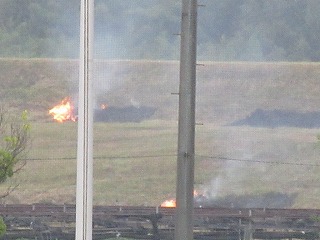 朝、この季節の風物詩でしょうか。木津川の堤防の刈られた草を燃やす煙が自転車道一帯に上がっていました。