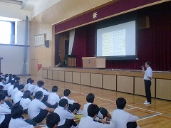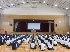 大きな事件事故等なくみんな元気で2学期を迎えられたことを喜び、この夏のサニブラウン選手の活躍や宇宙ステーションに向かった日本の輸送船「こうのとり」の快挙などのニュースの話をし、2学期も目標に向かってしっかりとがんばろうと呼びかけました。また、授業中のより良い学習の仕方(学び力)についても話しました。これについてはいずれ学校通信等で詳しくお知らせします。