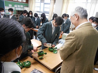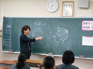 講師は、消防士の笠井先生、介護福祉士の柴田先生、お茶のお仕事をされている今村先生、美容師の高橋先生、京田辺市役所にお勤めの西川先生です。仕事上の苦労や生きがい、今の中学生に望むことなど、多岐にわたるお話や体験を準備していただきました。