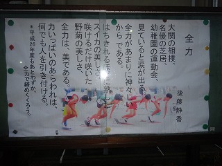 玄関の詩「全力」。 3学期、3年生にとっては中学校生活を全力で締めくくろう。
