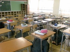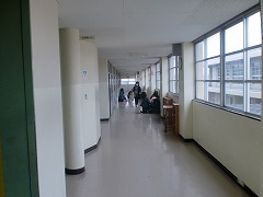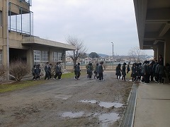 地震の放送後、近くの机の下に入り頭部を保護。廊下にいた生徒は、その場で頭部を保護。各自居た場所からバラバラに避難。外では急ぎ足。