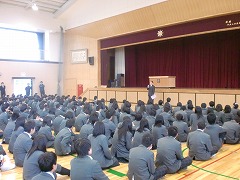 体育館では、明日、阪神大震災からちょうど20年になることや、日本は美しい国土を持っているが大変な地震国であることなどを話し、「天災は忘れたころにやってくる」ということを忘れず、きちんと備えを行うことが大切だと話しました。ご家庭でも、この機会に地震をはじめとした災害に対して、どのように備えるのか話をしていただいたらありがたいです。お家の近くの避難場所、連絡の方法なども確認をお願いいたします。