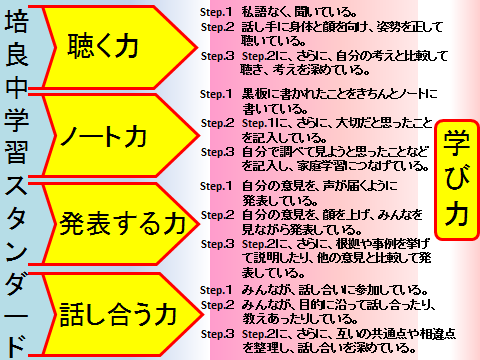4月18日、3年生は全国学力・学習状況調査を受けました。午前中4時間、国語と数学でした。活用の問題は、かなり長文を読みこなさないと、問題が、何を問うているのかさえわからないという難しさです。個別の知識を暗記していたり、簡単な計算ができるというだけでなく、学んだことを応用していく力が必要ですね。それとともに、しっかり聞き、読む力がどの教科でも求められます。各教室に掲示されている学び力を意識して授業に臨んでほしいと思います。