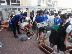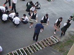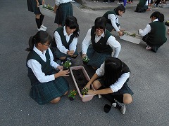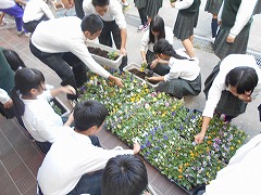 生徒会本部が作業の要領を説明し、プランターに土を入れ、花苗を植え付け、約40分ほどで、プランターにパンジーやビオラが植え付けられました。これから秋冬も花は見られますが、初春には、多くの美しい花を咲かせることでしょう。