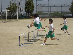 1年男子体育はグランドでハードルの練習に取り組んでいました。ハードル間を3歩で走る練習を繰り返していました。普段の走行の歩幅と違うので難しかったようです。
