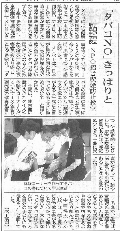 9日に行われた本校の喫煙防止学習の様子が、洛南タイムスの記事として掲載されましたので紹介します。洛南タイムスの木下様、ありがとうございました。