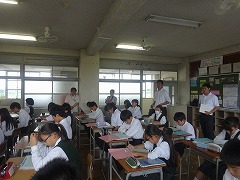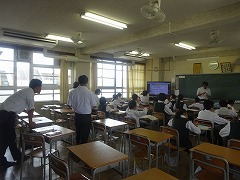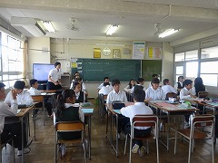 小学校で外国語活動として両小学校でやり方を統一しつつ、それを中学校の英語にどのようにつなげていくのかが大きなテーマとなっています。そこで、中学校1年生で、どのような英語の授業が行われているのかを見に来られました。3講座とも1年生諸君は頑張っていました。ペアでプラクティスを行ったり、大型テレビに映し出されるデジタル教科書を使いながら、積極的に学習していました。