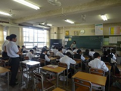本日6時間目、1年生の英語の時間(1・2組 少人数授業)に、田辺東、草内両小学校の先生方が参観に来られました。小学校でも外国語活動がありますが、その授業に、本校から小中連携加配の先生も参加して、小学生を教えています。小学校の外国語活動ですから、基本的には英語に慣れ親しみ、英語を使ったゲームや活動を楽しんだりするのが主ですが、培良ブロック全体として、外国語活動でチャントや、文字に親しむフォニクスも取り入れています。