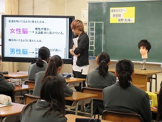 消防士の佐藤先生、介護士の安達先生、日本茶問屋の山北先生、美容師の槙野先生・高橋先生、旅行添乗員の畑中先生の6人の社会人の方々に講師を担当していただきました。貴重な経験の中から、その仕事をなぜ選んだか、仕事上の喜びややりがい、苦労などをお話しいただきました。