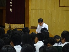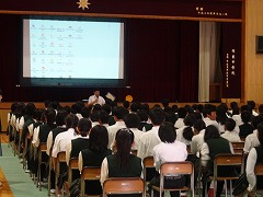 2年生は、6校時、体育館で飲酒防止教室を行いました。講師は本校の学校薬剤師の山崎先生です。スライドを見ながら、中学生の時期の未来への可能性、その大切な心と身体を傷つける飲酒の危険性、身体への具体的な影響、アルコール依存症などの話があり、みんな真剣に話を受け止めていました。山崎先生、どうもありがとうございました。