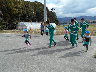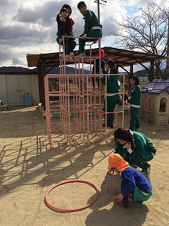 3月7日(火)公立中期選抜を受けない生徒は、午前中、草内、田辺東の両幼稚園に分かれて幼稚園交流に出かけました。田辺東幼稚園はこの日は、防賀川公園まで遠足に出かけ、園児たちと童心(?)に帰って一生懸命遊びました。草内幼稚園では、園児と一緒に幼稚園の周りをランニング。中には8周も回った人もいました。