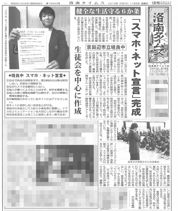 昨日のスマホ宣言発表の様子が「洛南タイムス」で新聞報道されました。紹介します。洛南タイムス様、ありがとうございます。