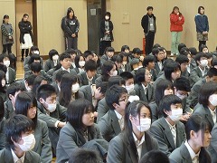 2月26日、今年度最後の終礼を行いました。校歌を歌った後、私からはソチ五輪の葛西選手や浅田選手の活躍と感動について話しました。決してあきらめない、失敗をしても腐ったり、逃げたり、人のせいにしたりしないで何度でも挑戦する勇気と、支えてくれる周りへの感謝の心について話しました。表彰の後、生徒指導部から、当たり前のことを当たり前にやる大切さの話がありました。とくに3年生には「有終の美」という言葉通り、最後の10日余りの中学校生活をしっかりと過ごしてほしいと思います。
