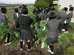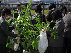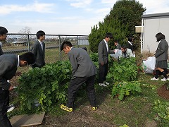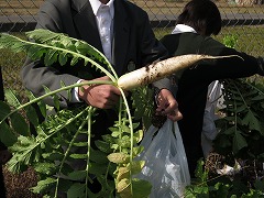 2年生の技術科の授業の栽培の分野で、秋に、袋に大根の種をまきましたが、1昨日から収穫を始めています。過去2年、葉ばかりが茂り、実が大きくならなかったのですが、今年は、例年より以上に葉が茂り、大きな大根が収穫できました。植物(特に野菜)を栽培する機会はあまりないので、みんなにとって良い経験になったと思います。