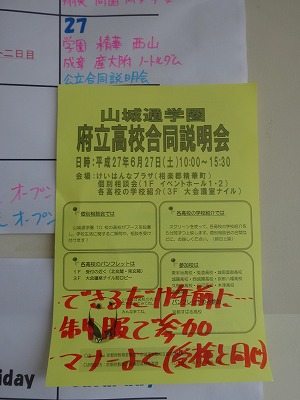 3年生の学年廊下が進路関係の掲示物で、かなりいっぱいになってきました。明日は、けいはんなプラザを会場に、山城通学圏の府立高校合同説明会あります。ぜひ訪れて、進路選択の一つにしてください。
