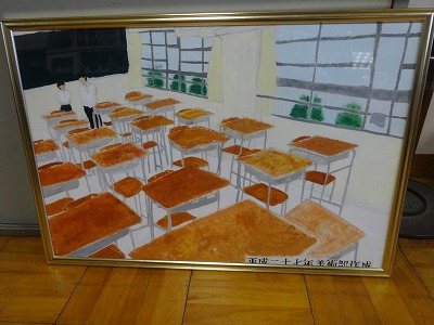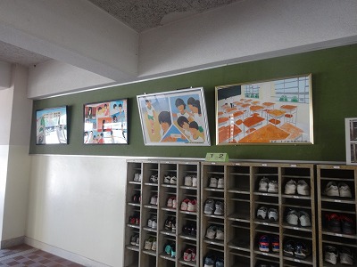 生徒昇降口に、今年も、美術部で描き上げた共同作品が展示されました。毎年1作品、登校してきた生徒が頑張れるような、学校生活をテーマにした作品を、私から美術部に注文し、昇降口を飾っています。今年で4作品が並びました。いずれも力作で、学校の伝統として引き継いでいきたいと思っています。