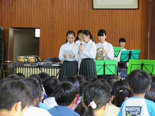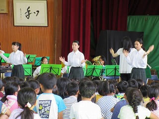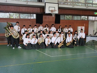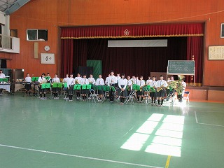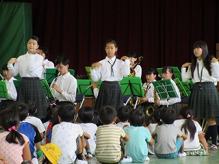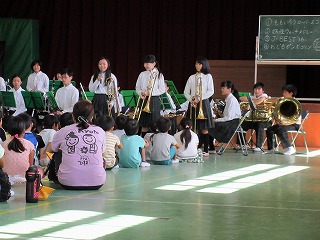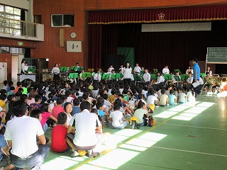 田辺東小の土曜授業に呼んでいただき、朝、東小体育館で演奏会をしました。小学生が知っていて、乗れる曲を5曲用意し、楽器紹介や踊りを披露するなど、楽しい発表となりました。東小の児童は、生の楽器の音に触れ、自分たちのお姉さん、お兄さん世代の、一生懸命の姿に、しっかりと見て聴いて応援してくれました。