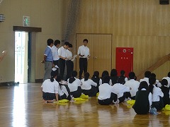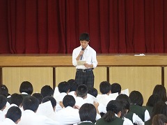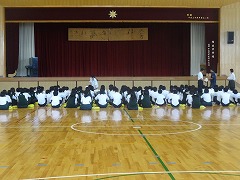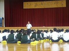 3校時は3年生。どの学年もベル前に集合完了していましたが、3年生はさらに早く始まりました。1時間の集会中、ほとんどみんなの頭がふらふらと動かない、素晴らしい集中力でした。家庭学習の質向上、掃除や朝読書の頑張りなど、多くの成果が報告されました。しかし、ベル着はできていても、ぎりぎりであったり、ベル準までは、まだまだ完璧でない人もいるようです。2学期は、進路決定の時期となるので、夏休みからしっかり頑張るという決意をみんなで新たにしていました
