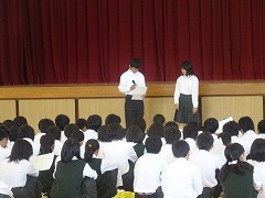 4校時は1年生。3人の司会者が頑張って集会の進行をしました。各学級様々な成果と課題がありますが、学年全体として、団結力、授業の意識、学習スタンダード、友人関係の4つのキーワードで、成長したところを捉えることができました。しかし、授業中の集中力や休み時間の喧騒等、課題も明らかになりました。各学級の様子を評議員が発表し終わると、温かな拍手で、学年みんなでたたえていたことが印象に残りました。
