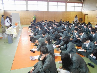 3年生は今日から特別時間割に入りました。式&送る会練習の後、京田辺市社会福祉協議会の皆様を講師に迎え、認知症サポーター養成講座に取り組みました。私は他の校務で残念ながら見ることはできませんでしたが、認知症のお年寄りの特徴や接し方等をお話と寸劇で学びました。