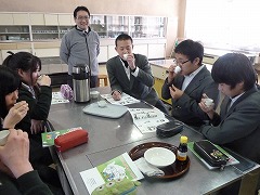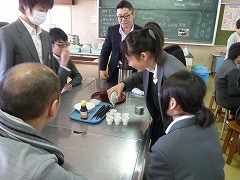 2月21日(金)、3年生は各学級ごとに玉露の入れ方、味わい方の授業を受けました。講師は京田辺市茶業青年団の6人の皆様です。玉露を入れる時のお湯の温度が、思っていたより低いことや、1杯目と2杯目では、お茶の甘さが微妙に違うことなどを教わり、実際に飲んでみて実感しました。1杯目と2杯目では、お茶を急須に入れておく時間も変えなければ、お茶の微妙な味は出せないこともわかりました。