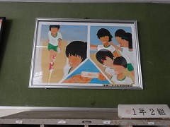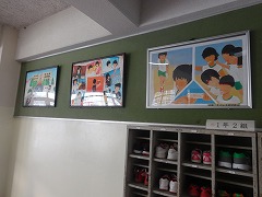 英語の日放送風景 美術部共同作品 体育大会をモチーフに 生徒昇降口