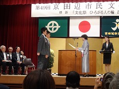 今日は、京田辺市の市民文化祭です。記念式典で、教育文化功労者表彰が行われ、培良中学校のハンド部男子も、夏の全国大会の優勝によって、表彰を受けました。石井市長様をはじめ多くの来賓、市民から祝福を受けました。関係者の皆様、ありがとうございました。