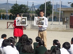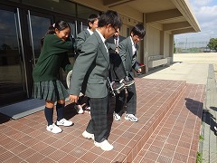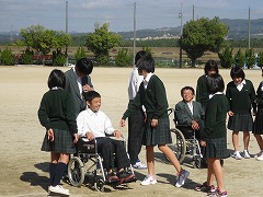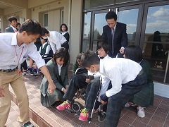 1年生は、各学級ごとに車いすの体験を行いました。今回は自走ではなく、介護者が押して車いすで移動する体験です。途中、ぬかるみや段差を設け、最後は、階段を4人で車いすに人が乗ったまま担いでおろすこともやりました。乱暴に扱われると乗っていて怖い思いをしたり、ちょっとした段差や障害物が、通行の妨げになることがよく理解できたと思います。