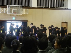 1・2年生は、6校時、体育館で高校出前講座を受けました。京都明徳高等学校ダンス部と顧問の岩倉先生にお越しいただき、岩倉先生からは、高校選びのポイントを教えていただき、ダンス部のパフォーマンスを見せていただきました。