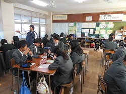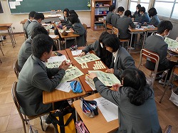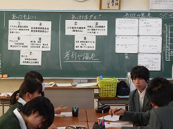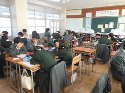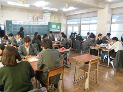 1年生は身近な人権を考えるということで、いじめについて学び、考えました。本校には2年前、全校生徒で考え、意見を出し合い採択した「いじめ追放宣言」があります。いじめについて鋭いアンテナを張ると同時に、いじめの構造について学びました。