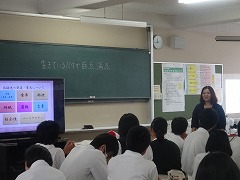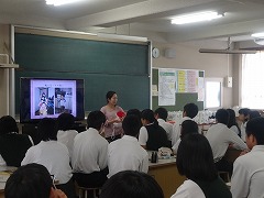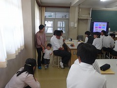 2校時~4校時、3年生は、1学級ずつ、家庭科の時間を使って、「命と子育ての学習」を行いました。講師は、助産師の西先生と、中屋先生です。スライドを使って、赤ちゃんの誕生、子育ての楽しみと苦労等のお話をしていただきました。また、西先生のお子さん(2歳)も連れてこられ、2歳くらいの子どもの生活と成長についてのお話もしていただきました。