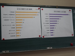 3年生は、各学級、家庭科の時間を使って、京田辺市の市民参画課のご協力を得て、「男女共同参画ワイワイミーティング」を行いました。男性に向く職業、女性に向く職業をあらかじめ選んでおいて、その職業について、なぜそうなのかを、班で話し合い、まとめました。